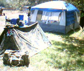 With property owners to break in, and a new property to work up, this was our first campout on our home turf in 7 years to occur on a new property. Due to the wind and the unfamilarity with the property, setup took a horrendous 4 hours for everybody to show up, set up, and get the commons area running. Plumbing was also a bit of a surprise problem so I found myself scrubbing the porcelein throne while Gizmo, et al. were setting up the commons. But this is all the price paid when trying a new property as opposed to one that has been being used for some 7 years. In all due probability, we shall return to the certainty and rote of Kbubble's property for our Fall Batleth Tournament.