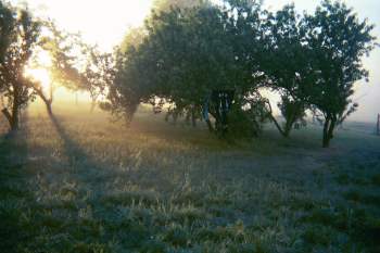 On Saturday morning, it was a glorious and beautiful morning. But Sunday gave us the mist that we so desparately needed. At 0600, with the sun still behind the mountains, mist surrounded our tents and you could not see into the valleys that well. The Dueling Fields were down there in a gentle haze. This was truly Klingons in the Mist. There were banners hanging everywhere. It was glorious and looked great.