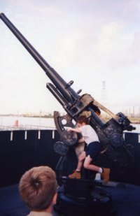 To assist the Scouts (and my kids) in understanding the realities of combat as well as working together as a team under stress, the next event was a simulation of an air attack. Division 3 (ours) was issued life jackets and told to prepare a 40mm mount for action. Gunners were emplaced in their seats with backup gunners on the mount behind them. The rest of the division was placed behind the mount in a semicircle. The gunners were to run the point/train functions of the gun while the others were to pass a stripper clip of 40mm rounds as quickly as possible. That way feeding the guns was simulated while the mount was moving. At random, casualties were tapped and told to fall down. The ammunition haulers were to take the place of the casualties as soon as the medics pulled them away from the mount. The casualties were "healed" and allowed to return to the mount as ammo haulers. One casualty was fatal and he was covered by his life jacket and left on the deck. (This casualty was selected by the adults by being the primary discipline problem.) When the exercise was over, a funeral was held for the casualty and we pretended to toss him overboard. Thus the troublemaker lost out on some of the fun while being made a disciplinary example.