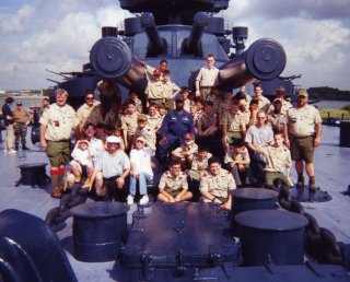 While the Scouts were having a snack time and viewing historical movies and presentations about the ship, the adult males were taken out of the general meeting in the 5 inch casemate known as "The Dreadnought Room". We went up to deck 1 to arrange the "night watch". Each hour of the night was a have an adult watch to make sure that the children did not roam the ship and remained in their respective 5 inch casemates on deck 2. It was interesting to roam the blacked out ship in the dark and to walk under those 14" BLR's. During our vacation, a gas well in another county blew. We could see the glow in the humid air and reflecting off of the clouds of the gas well fire even though it was a county away. Just looking off the port side, you could see that incredible glow.