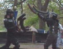DaQ'tag - This was instituted Spring 2001. It was single DaQ'tag against single DaQ'tag until Spring 2002. Then the same single-single / dual-dual Rules were instituted. Another exception to the normal Rules and Judging process arises with DaQ'tags. They are so fast and personal that the Combatants MUST call their own wounds/deaths.* The Judges attempt to continue their function, but the Combatants MUST assist the Judges with "on your Honor" announcements of incoming hits. This is where having eliminated "immortals" allows another form of competition. "Immortals" would quickly wreck the fun of this Class. It is fast, brutal and must have the Honor of the Warrior. The nature of the fighting is such that it is not unusual to see "10 to 10" scores to settle a 3 point fight. The record at this time was a 17 to 17 bout to settle a 3 point fight.