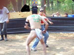 * As of 2004, a twist was added that later in 2005 became design. In 2004, those brave enough to cling to our keltic heritage wore loinclothes into the ring. We also painted the blades. The thought was that by not wearing clothing, we did not care about losing those clothes to the paint. The loinclothes were a concession to a) the spectators present, and b) the Internet. Otherwise, knowing that our ancestors fought wearing only woad, we would have done so. Our keltic forefathers wore only woad into battle. We would have fought in that manner except for those two aforementioned American prudish concerns. The paint strikes made judging easier as the paint told the truth of the strike. The original reasoning was that we were not wearing clothes that could be damaged by paint thus we painted our blades. By 2005, combatants were asked to wear disposable white Tshirts if they were not able to go shirtless. By 2006, disposable Tshirts were being issued to Warriors of either gender by the IKV Melota in order to allow the paint to tell the tale of combat.