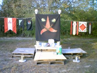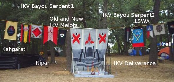 Use flags and banners to announce the participants. Each ship should have its own banner. Each House or Clan should have its own banner. The picture shows all of the klingon ships that participated in that Tournament. Due to space constraints, not all of the family banners could be strung up with the stage. That does not matter, there were and can be poles, spears and other strung lines with the colors and symbols get the point across that this is a well participated event. Make sure that every banner is up.