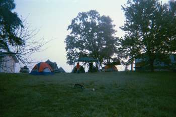 On Saturday morning, it was a glorious and beautiful morning. But Sunday gave us the mist that we so desparately needed. At 0600, with the sun still behind the mountains, mist surrounded our tents and you could not see into the valleys that well. The Dueling Fields were down there in a gentle haze. This was truly Klingons in the Mist. There were banners hanging everywhere. It was glorious and looked great.