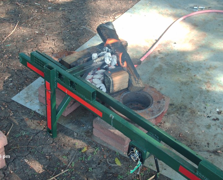 I dropped a Bus disk brake (retired) onto a Karmann disk (also retired) and filled it with ordinary grilling charcoal. I hit it with 5 pounds of air. I managed to hammer the Bumper Mark I back into shape enough to put it back on and use it until I had built the bumper Mark II.