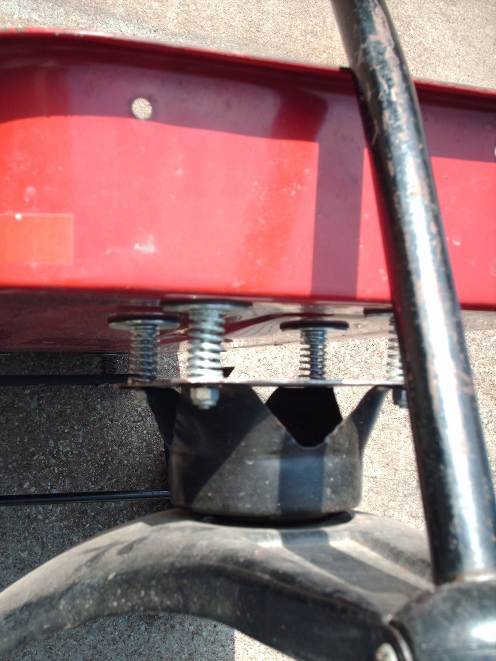 This is a small pan that was salvaged from an illegal dump and set up for towing behind the "Challenge" bicycle as a full trailer. It is used for towing items that would be hostile to a cloth semi trailer. It is also for road speeds up to 10mph. The tires are lawn mower solids and have no actual cushion within themselves. This is the speed limiting factor.